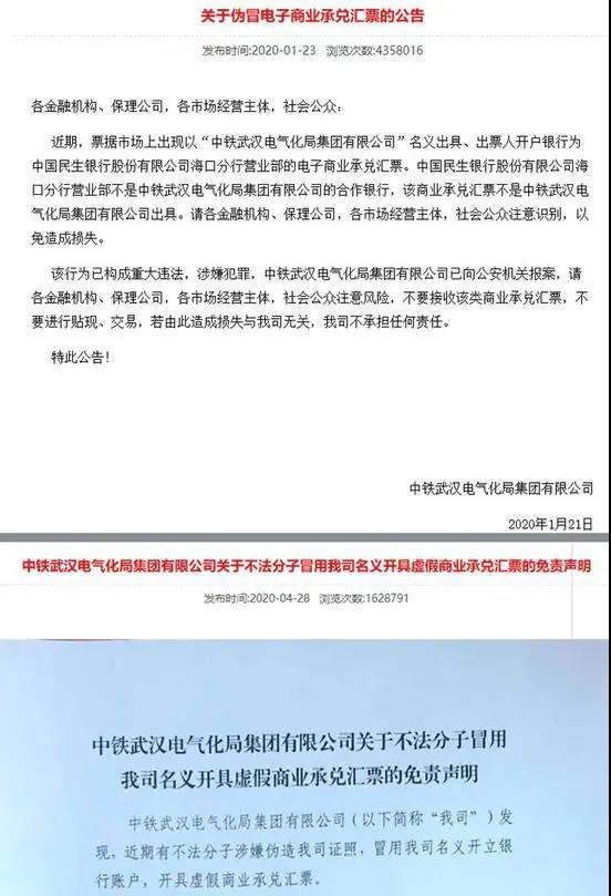 2020年5月底,全国首例电票系统诈骗案刚刚宣布告破。6月初,就有国企再次发布被冒名开具虚假票据的声明。小到几十万元、多达上亿元的票据交易,是不法分子期待非法谋利的“大好”领域。有央企为此半年三次发声明:
