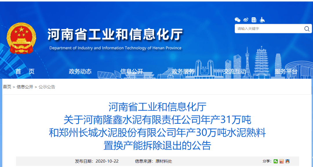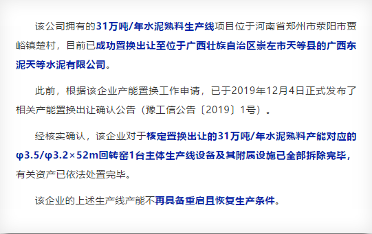 一、关于河南隆鑫水泥有限责任公司年产31万吨水泥熟料已置换产能拆除退出情况。该公司拥有的31万吨/年水泥熟料生产线项目位于河南省郑州市荥阳市贾峪镇楚村,目前已成功置换出让至位于广西壮族自治区崇左市天等县的广西东泥天等水泥有限公司。此前,根据该企业产能置换工作申请,我厅已于2019年12月4日正式发布了相关产能置换出让确认公告(豫工信公告〔2019〕1号)。经我厅核实确认,该企业对于核定置换出让的31万吨/年水泥熟料产能对应的φ3.5/φ3.2×52m回转窑1台主体生产线设备及其附属设施已全部拆除完毕,有关资产已依法处置完毕。该企业的上述生产线产能不再具备重启且恢复生产条件。