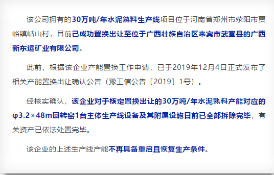 二、关于郑州长城水泥股份有限公司年产30万吨水泥熟料已置换产能拆除退出情况。该公司拥有的30万吨/年水泥熟料生产线项目位于河南省郑州市荥阳市贾峪镇岵山村,目前已成功置换出让至位于广西壮族自治区来宾市武宣县的广西新东运矿业有限公司。此前,根据该企业产能置换工作申请,我厅已于2019年12月4日正式发布了相关产能置换出让确认公告(豫工信公告〔2019〕1号)。经我厅核实确认,该企业对于核定置换出让的30万吨/年水泥熟料产能对应的φ3.2×48m回转窑1台主体生产线设备及其附属设施日前已全部拆除完毕,有关资产已依法处置完毕。该企业的上述生产线产能不再具备重启且恢复生产条件。