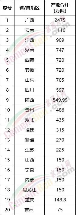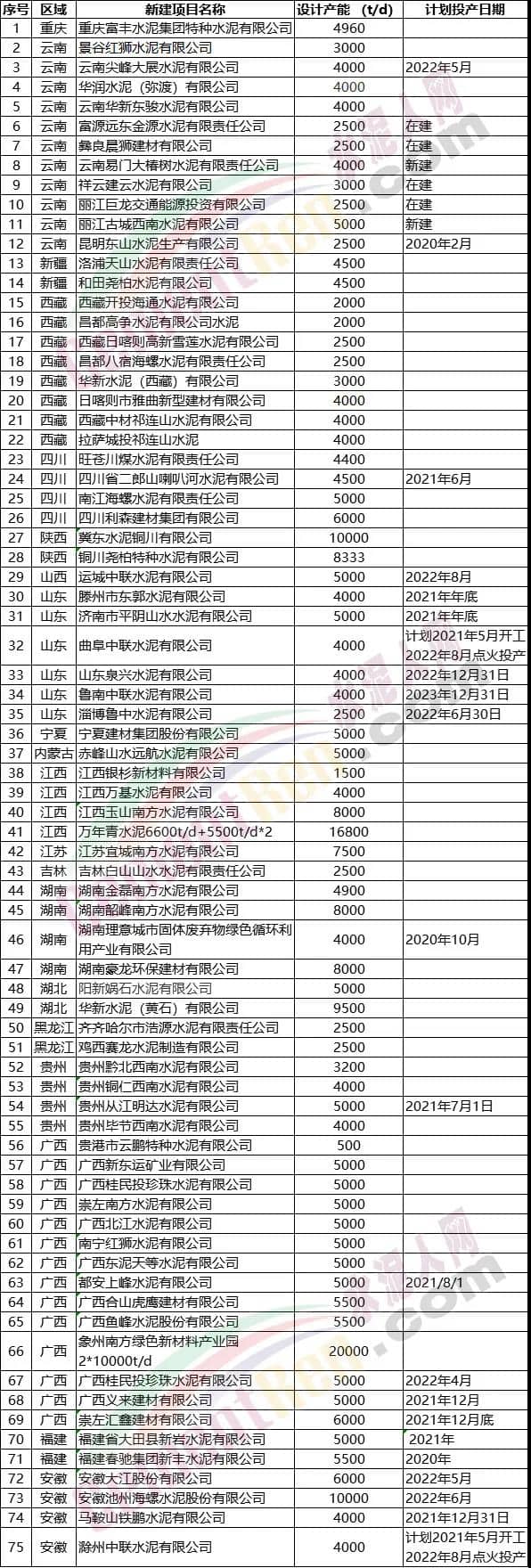 在75条熟料生产线1.1亿吨产能中,广西区域2475万吨/年,云南1110万吨/年,江西909万吨/年,湖南747万吨/年、西藏720万吨/年,详情如下:
