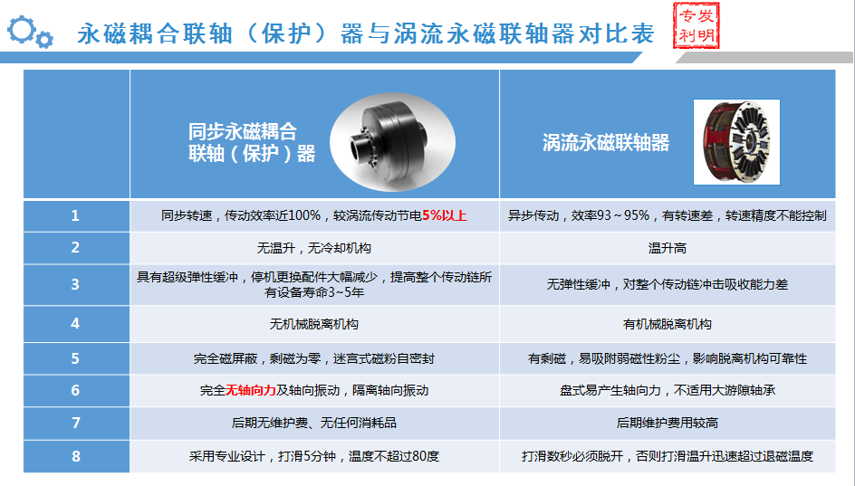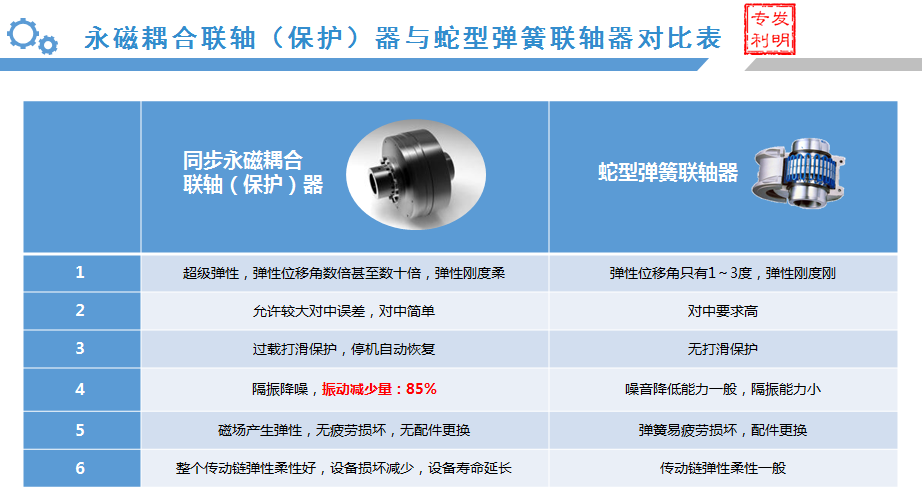 作为国内专业生产耦合器的企业,江苏磁谷自主研发生产的永磁耦合联轴(保护)器采用双永磁筒式结构,利用稀土永磁纯物理吸力(无电磁感应)产生大弹性位移,同步传递转矩,广泛应用于水泥、电力、钢铁、矿山、煤炭等行业提升机、斜拉链机、皮带机、斗轮机、风机、水泵等动力系统,取代限矩型液偶、蛇形弹簧联轴器等冲击大、振动大的刚性联轴器及涡流永磁联轴器。