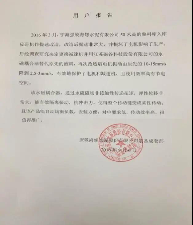 据江苏磁谷负责人介绍,其另一款节能新产品绕组永磁耦合调速器也已经成功应用于海螺水泥。