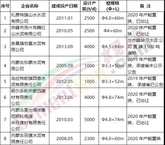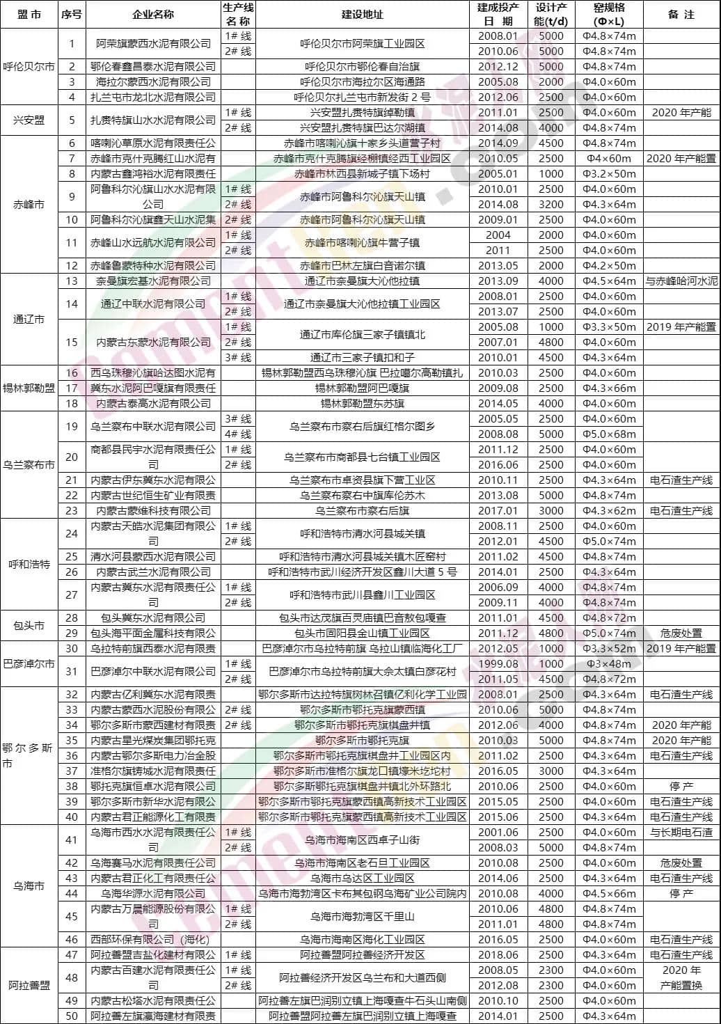 内蒙古自治区水泥熟料生产线清单