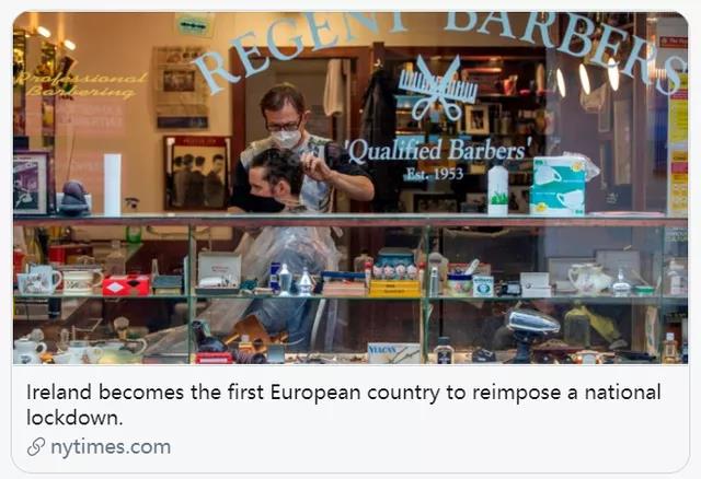 爱尔兰总理米歇尔·马丁20日宣布,自10月22日起再度全国“封城”6周,直到12月初。非必要经营场所一律关闭,超市、药房、邮局和银行等不受影响。餐馆、咖啡馆和酒吧仅限外卖服务。民众外出活动范围仅限住所5公里范围内。