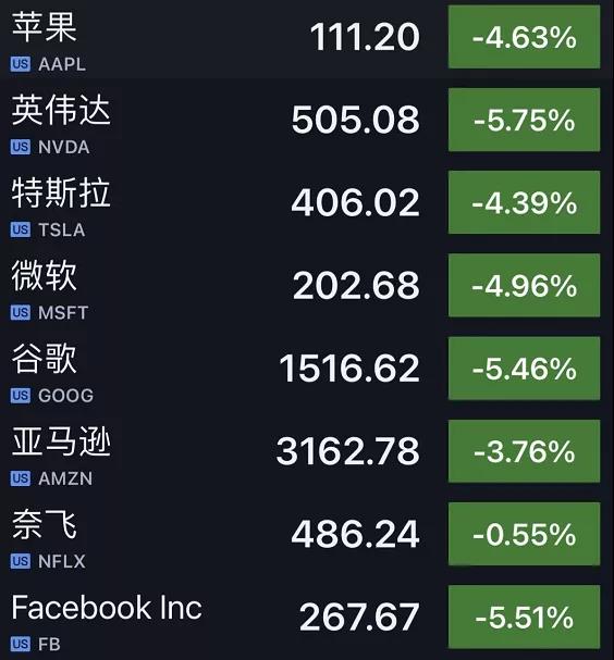科技股领跌纳指,英伟达跌超5.7%,谷歌、推特、微软均超5%,苹果跌逾4.6%。