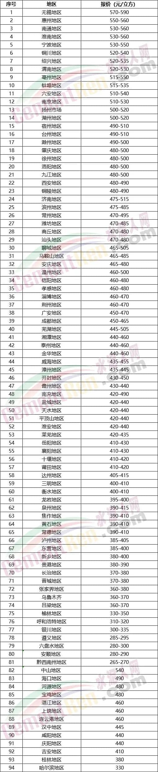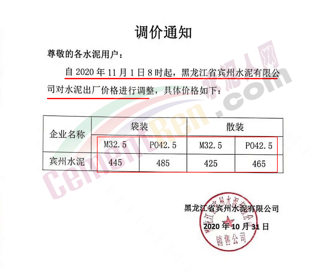 同日,黑龙江宾州水泥有限公司也通知自今日(11月1日)8时起,对水泥出厂价格进行调整,调整后M32.5袋装水泥执行445元/吨,PO42.5水泥执行485元/吨,M32.5散装水泥执行425元/吨,PO42.5散装执行465元/吨。