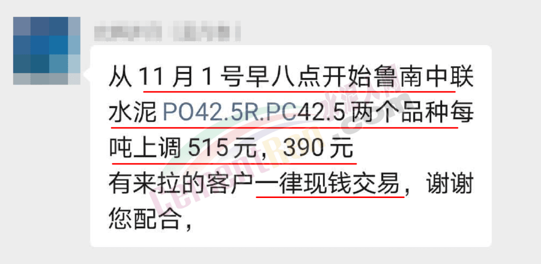 昨日,山东区域主导企业中联水泥也发通知称自11月1日起上调PO42.5R及PC42.5两个品种水泥价格,上调后PO42.5R水泥执行515元/吨,PC42.5水泥执行390元/吨。