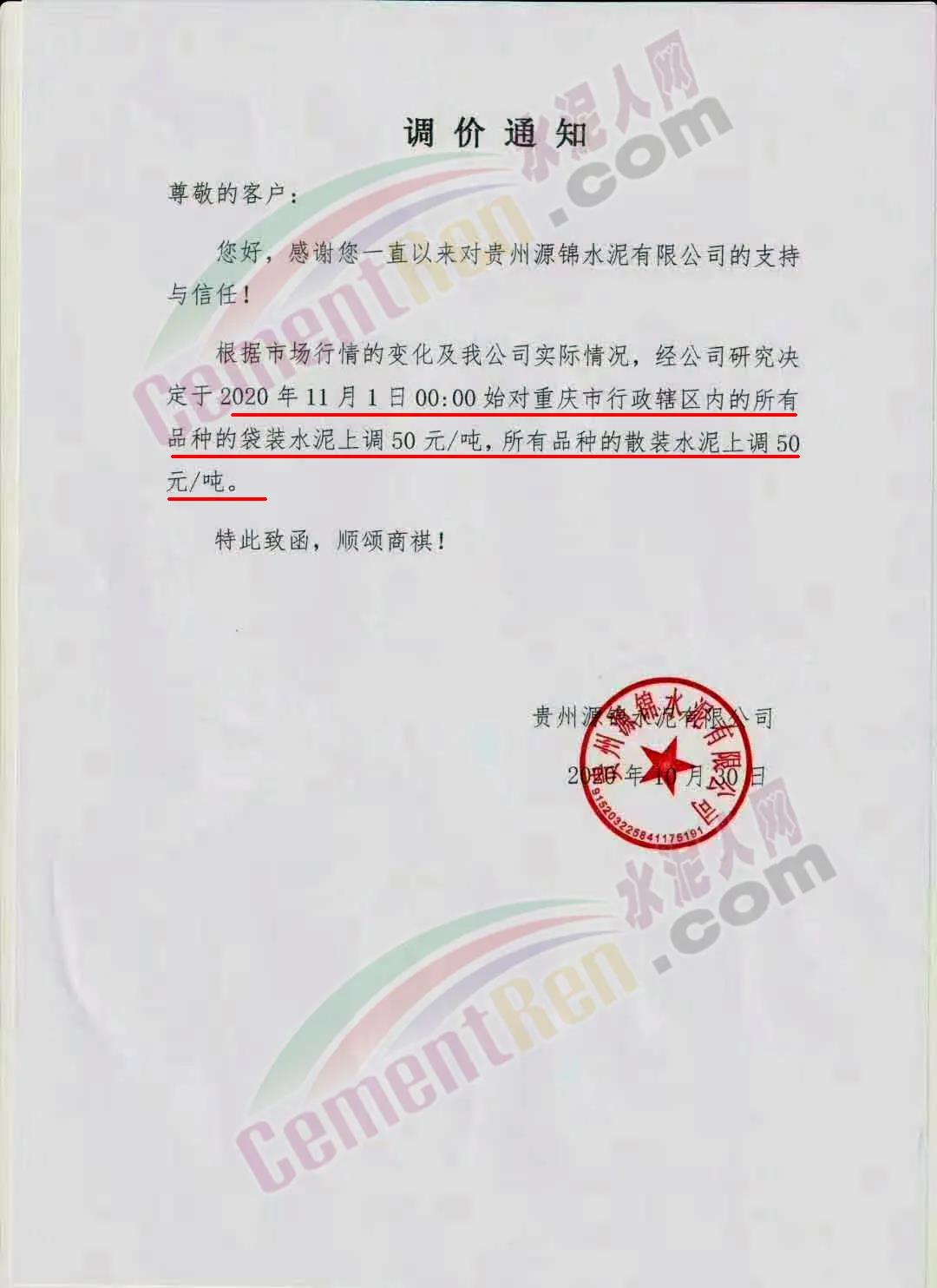 贵州源锦水泥通知,根据市场行情的变化及公司实际情况,经公司研究决定于11月1日0时对重庆市行政辖区内所有品种的袋装水泥上调50元/吨,所有品种的散装水泥也同步上调50元/吨。