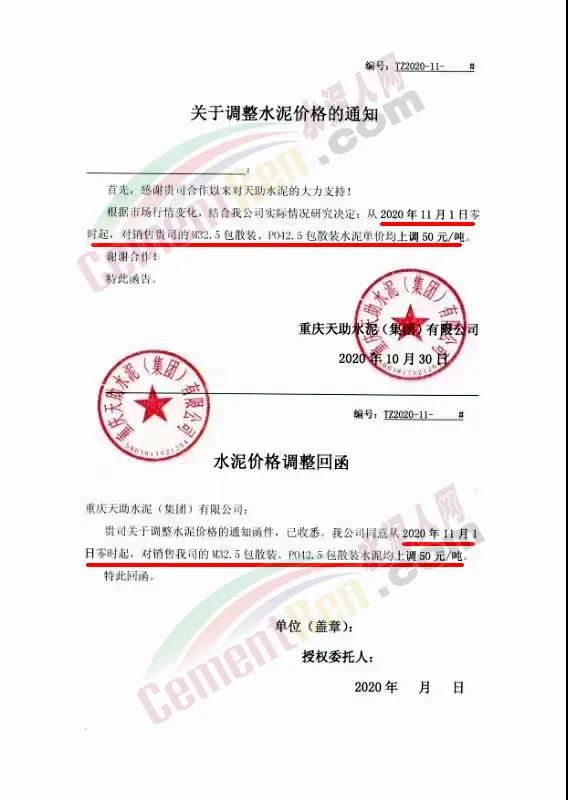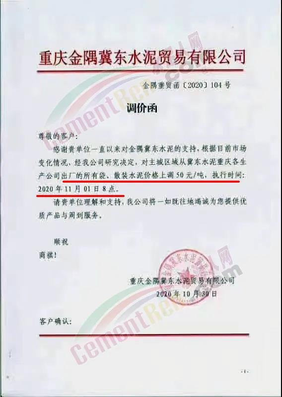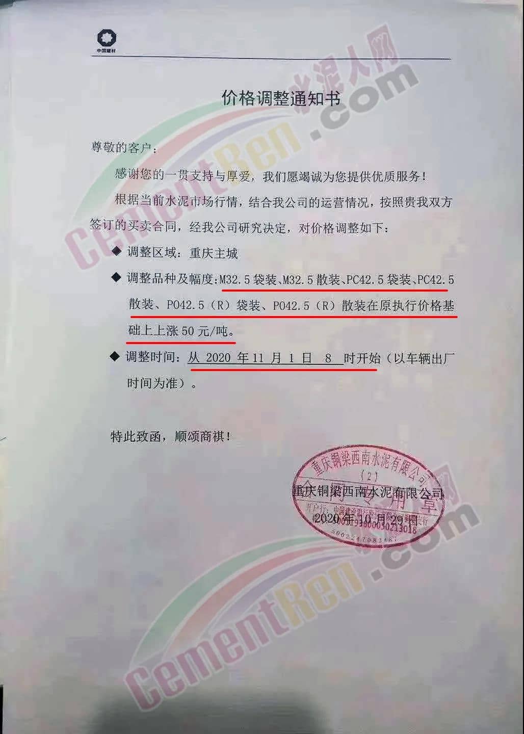 根据市场情况,经研究,决定从2020年11月1日零时起,本公司发往福建省内各品种各规格型号水泥在原价格基础上上调30元/吨。