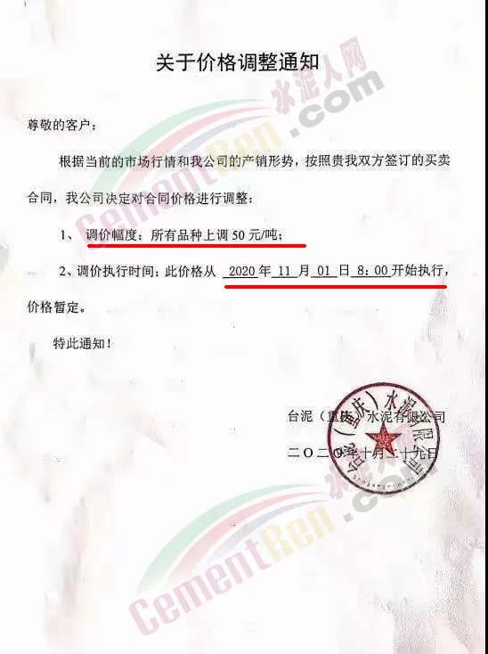 台泥水泥重庆公司通知,根据当前市场行情和公司产销形势,自11月1日早8时起上调所有品种水泥价格50元/吨。