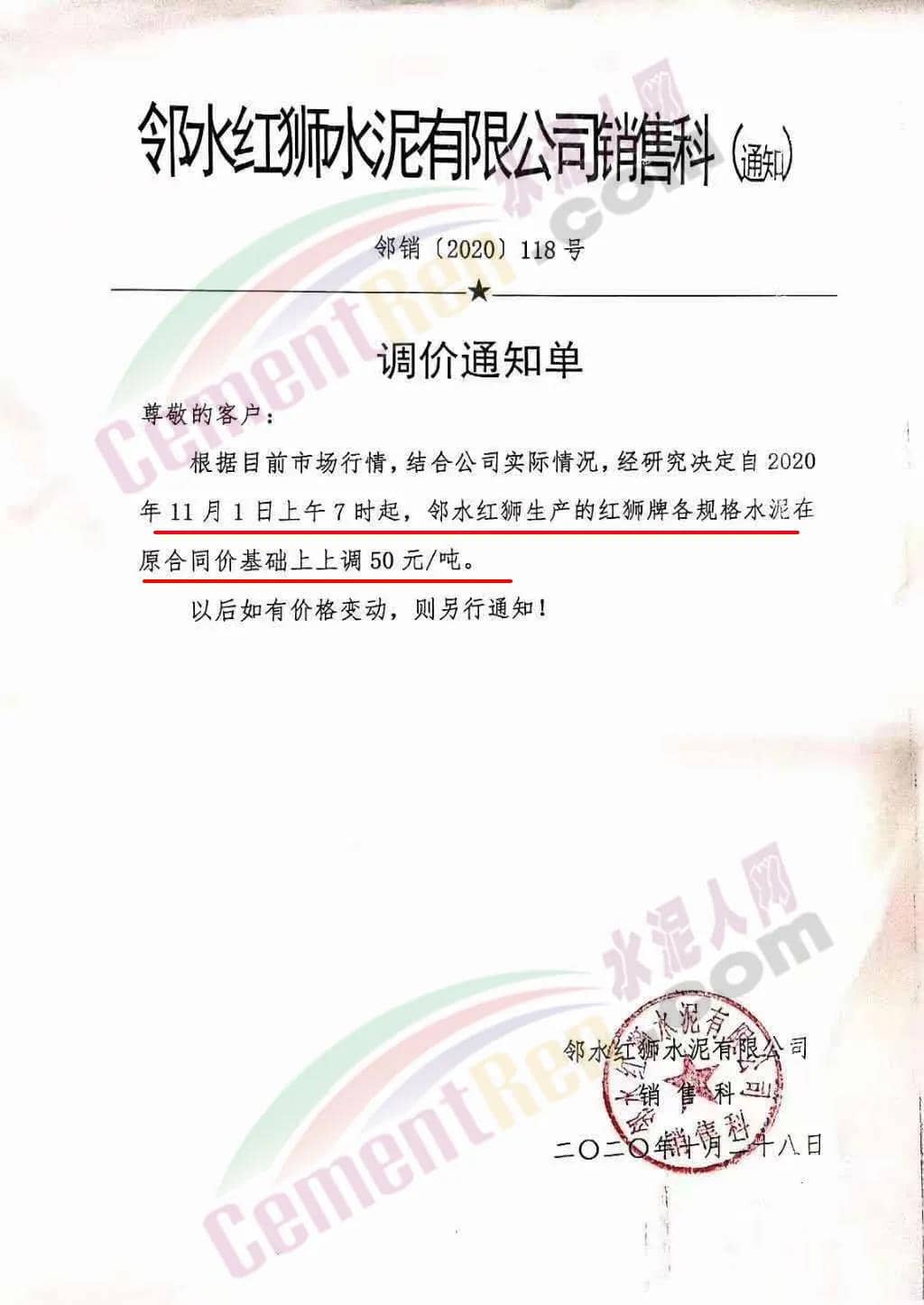 邻水红狮水泥销售科通知自11月1日早7时起,邻水红狮生产的红狮牌各规格水泥在原合同价基础上上调50元/吨。