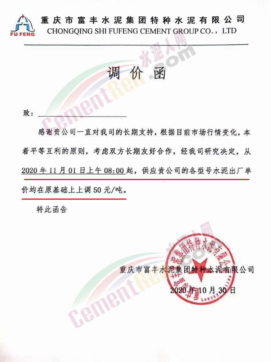 重庆富丰水泥通知11月1日上午8时起,各型号水泥出厂价上调50元/吨。