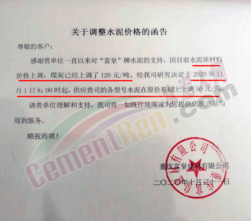 重庆富皇建材有限公司通知,因水泥原材料价格上涨,煤炭已经上调120元/吨,公司决定于11月1日8时起,上调“富皇”水泥各标号价格50元/吨。