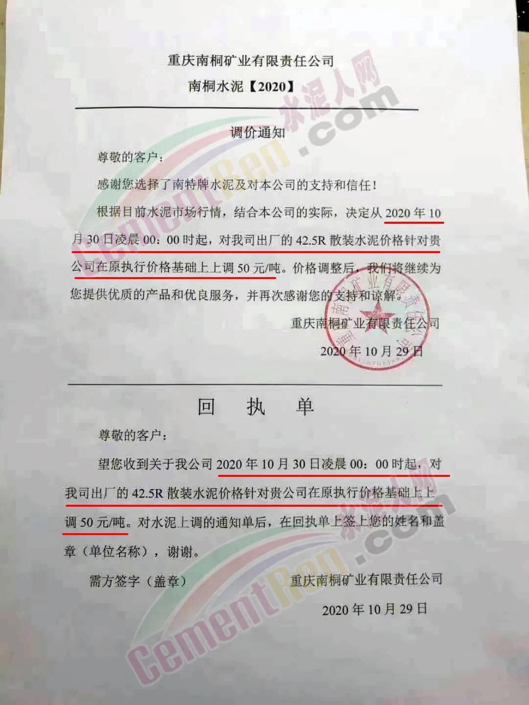 10月29日重庆南铜矿业通知自10月30日起,公司出厂的42.5R散装水泥上调50元/吨。