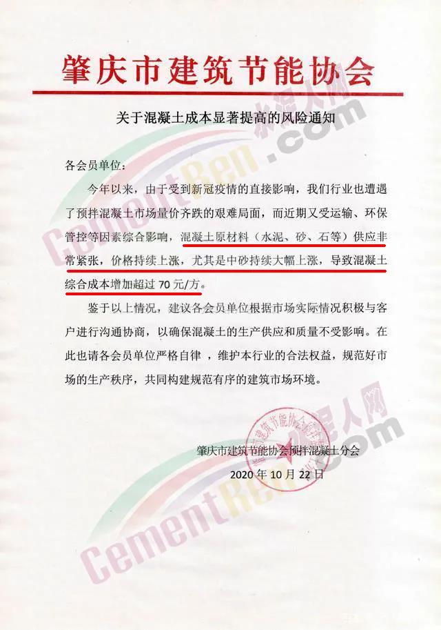肇庆市建筑节能协会预拌混凝土分会发布《关于混凝土成本显著提高的风险通知》称今年以来,由于受到新冠疫情的直接影响,行业遭遇了预拌混凝土市场量价齐跌的艰难局面,而近期又受运输、环保管控等因素综合影响,混凝土原材料(水泥、砂、石等)供应非常紧张,价格持续上涨,尤其是中砂持续大幅上涨,导致混凝土综合成本增加超过70元/方。