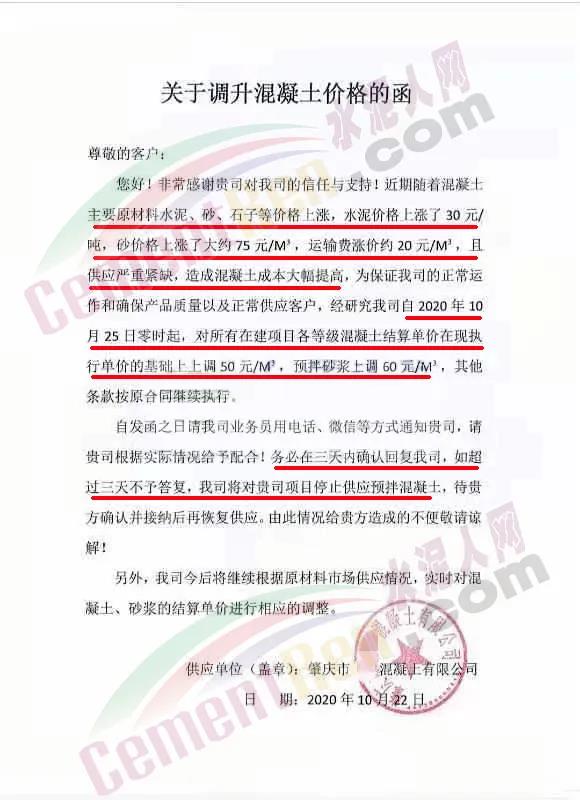 肇庆某混凝土公司发函通知称,近期随着混凝土主要原材料水泥、砂、石子等价格上涨,水泥价格上涨了30元/吨,砂价格上涨了大约75元/m³,运输费涨价约20元/m³,且供应严重紧缺,造成混凝土成本大幅提高,为保证公司的正常运作和确保产品质量以及正常供应客户,经研究公司自2020年10 月25日零时起,对所有在建项目各等级混凝土结算单价在现执行单价的基础上上调50元/m³,预拌砂浆上调60元/m³,其他条款按原合同继续执行。