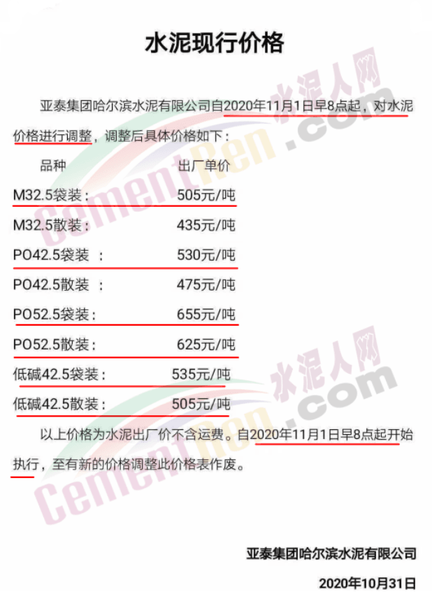 11月1日东北黑龙江区域主要品牌企业亚泰集团哈尔滨水泥公司通知11月1日早8点上调水泥价格,上调后多个品种标号水泥中不含运费出厂单突破500元/吨,其中PO52.5散装水泥报价625元/吨,PO52.5袋装水泥报价655元/吨,M32.5袋装水泥报价505元/吨,PO42.5袋装水泥530元/吨。