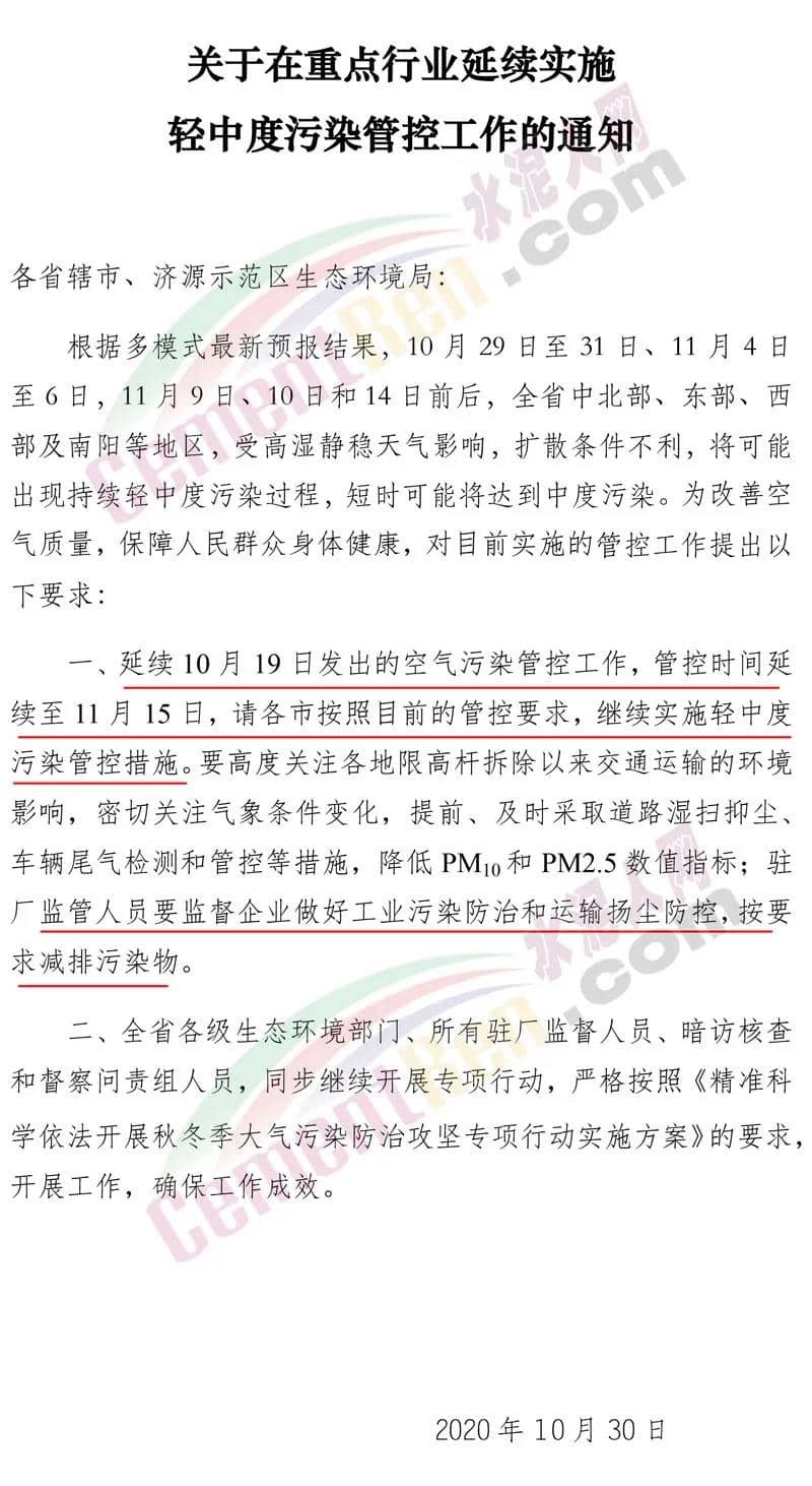 新乡市环境污染防治攻坚指挥部办公室发布《关于延续实施轻中度污染管控的通知》称,根据省厅《关于在重点行业延续实施轻中度污染管控工作的 通知》有关要求,于10月30日24时至11月15日24时延续实施轻中度污染管控。