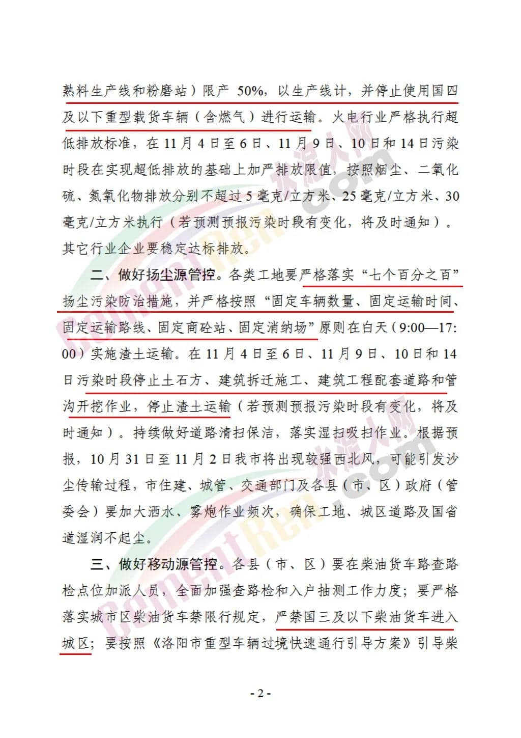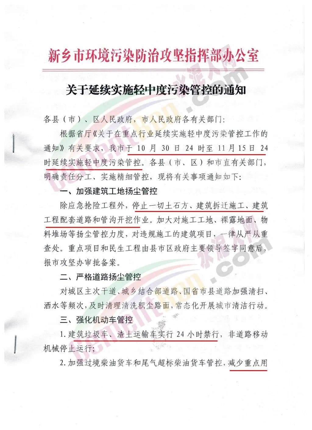 各类工地要严格落实“七个百分之百”扬尘污染防治措施,并严格按照“固定车辆数量、固定运输时间、固定运输路线、固定商砼站、固定消纳场”原则在白天(9:0—17:00)实施渣土运输。在11月4日至6日、11月9日、10日和14 日污染时段停止土石方、建筑拆迁施工、建筑工程配套道路和管沟开挖作业,停止渣土运输。通知原文如下: