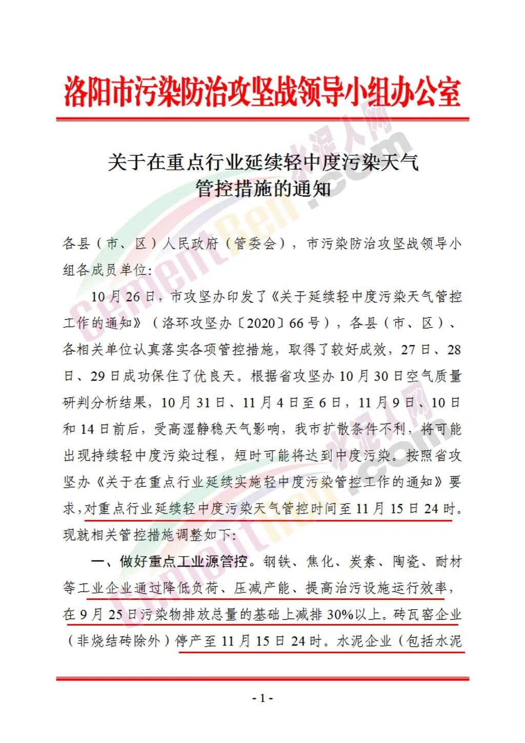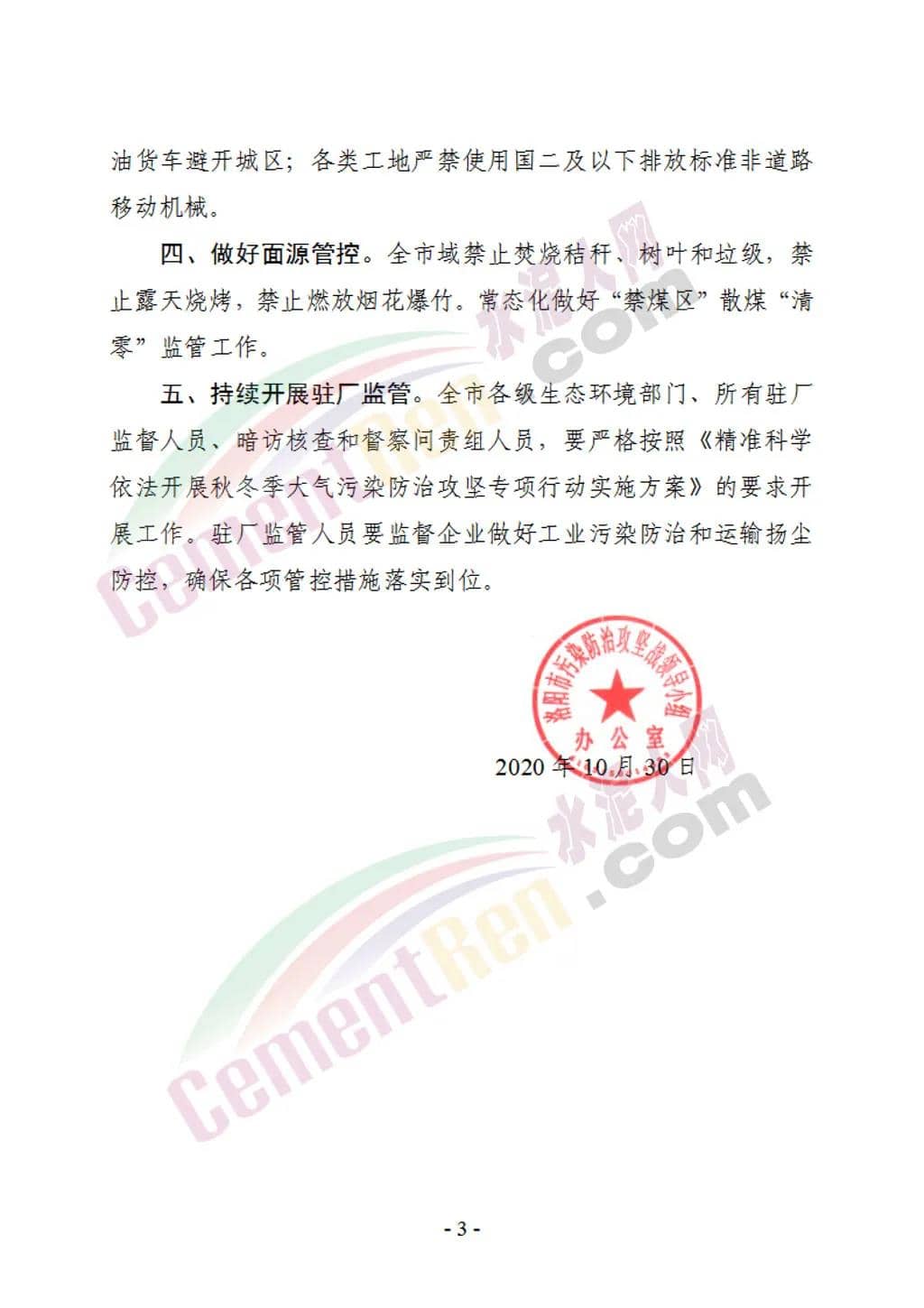 严格落实企业管控要求,水泥熟料、碳素、玻璃制品和陶瓷企业限产50%(含)以上(以生产线计,两条生产线的停产一条,单条生产线的停产);水泥粉磨站及水泥制品、石灰窑、矿粉、钙粉、商砕和沥青搅拌站等所有建材行业全部停产(绩效引领性企业除外);所有企业停止使用国四及以下重型载货车辆(含燃气)进行运输。通知原文如下:
