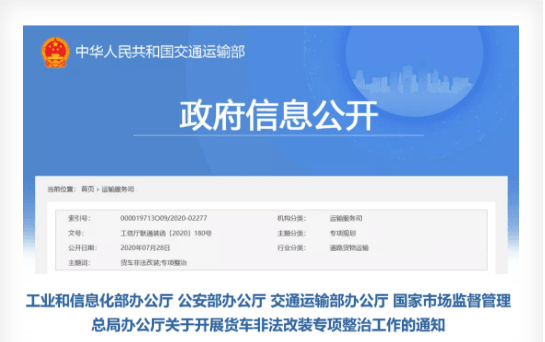 按照国务院安委会《全国安全生产专项整治三年行动计划》(以下简称《行动计划》)部署和《道路运输安全专项整治三年行动实施方案》(以下简称《实施方案》)要求,工业和信息化部、公安部、交通运输部、市场监管总局决定自2020年7月至2021年5月组织开展货车非法改装专项整治工作,预防和遏制货车非法改装行为,保障道路运输安全。具体事项通知如下。