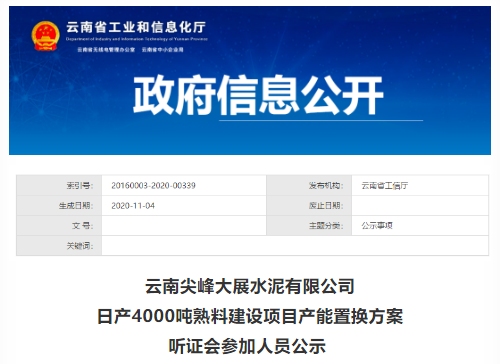 为贯彻落实《工业和信息化部办公厅 国家发展改革委办公厅关于严肃产能置换 严禁水泥平板玻璃行业新增产能的通知》(工信厅联原〔2018〕57号)文件要求,依法依规从严审核项目产能置换方案,防止弄虚作假,消除新增产能隐患,云南省工业和信息化厅决定委托中国国际工程咨询有限公司组织召开云南尖峰大展水泥有限公司日产4000吨熟料建设项目产能置换方案听证会。按照《云南尖峰大展水泥有限公司日产4000吨熟料建设项目产能置换方案听证会公告》参加人员构成及产生办法,经过公开自愿报名、推荐和邀请等方式,产生了参加听证会的相关人员。现公示如下: