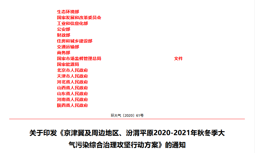《京津冀及周边地区、汾渭平原2020-2021年秋冬季大气污染综合治理攻坚行动方案》