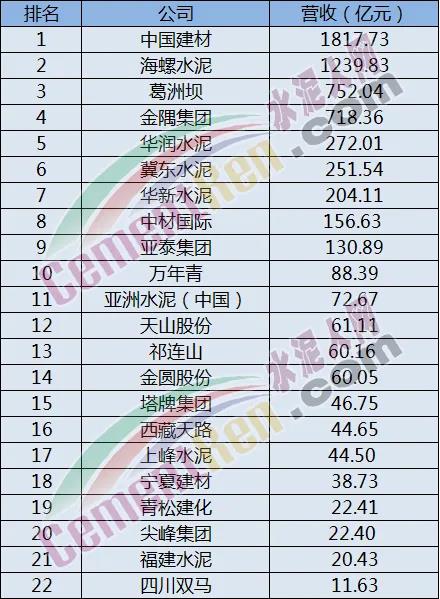 营业总收入是企业主要经营成果,也是企业取得利润的重要保障。在营业总收入排名中,中国建材以1817.73亿元稳居第一,第二名的海螺水泥1239.83亿元,第三名葛洲坝752.04亿元,第四名金隅集团718.36亿元,第五名华润水泥272.01亿元。中国建材与海螺水泥以千亿营业总收入远超于下面的企业,制霸排行榜第一、二名。