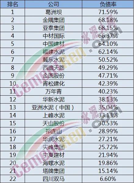 负债率往往也是观测一个企业发展与活力的重要数据,负债率太高或者太低,对于企业来说都不是一个好苗头。排名整体看来大部分企业的负债率都在正常范围内,除了第一名的葛洲坝,负债率达到了71.59%;第二名的金隅集团与第三名的亚泰集团负债率分别达到了68.18%和68.15%,第四名中材国际为66.37%,第五名中国建材为64.10%,海螺水泥处于倒数第三名,有19.86%的负债率,塔牌集团倒数第二为15.14%,四川双马是最后一名,负债率低至6.6%。