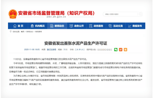 11月5日,安徽省政务服务中心省市场监管局窗口发出首张水泥产品生产许可证。