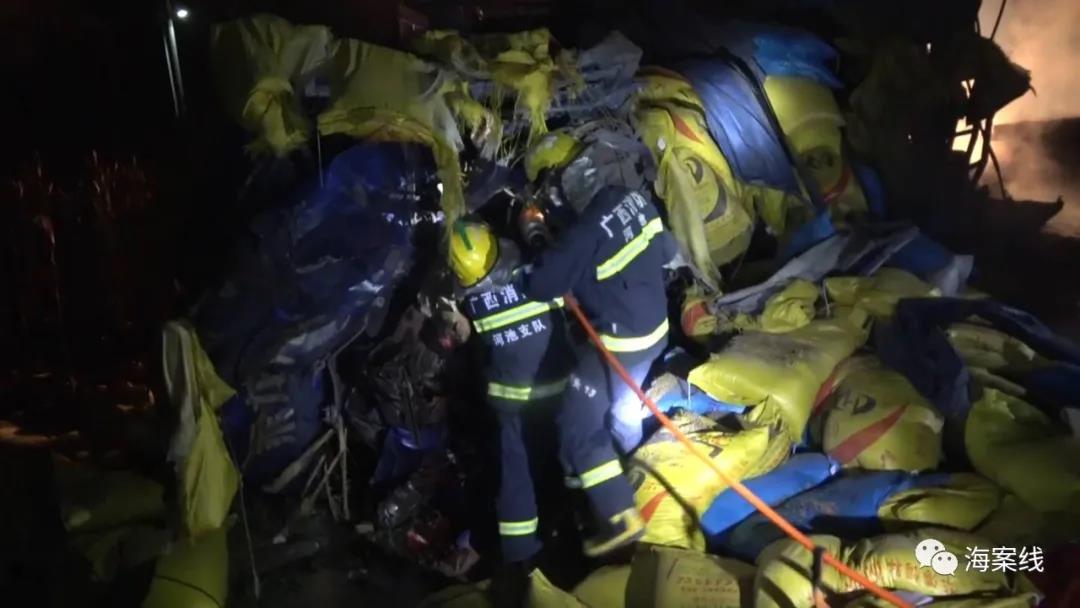 当天凌晨2点51分,都安安阳消防救援站接到警情后,立即赶赴现场救援。在事故现场,一辆运载水泥的挂车与一辆运载化肥的货车迎面相撞,水泥挂车燃起熊熊大火,两人被困火中无法逃生;运化肥的货车则是侧翻在一旁,车头已严重变形,一人被困驾驶室内,情况十分紧急。
