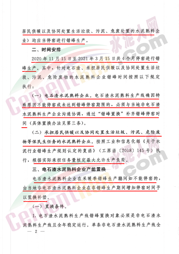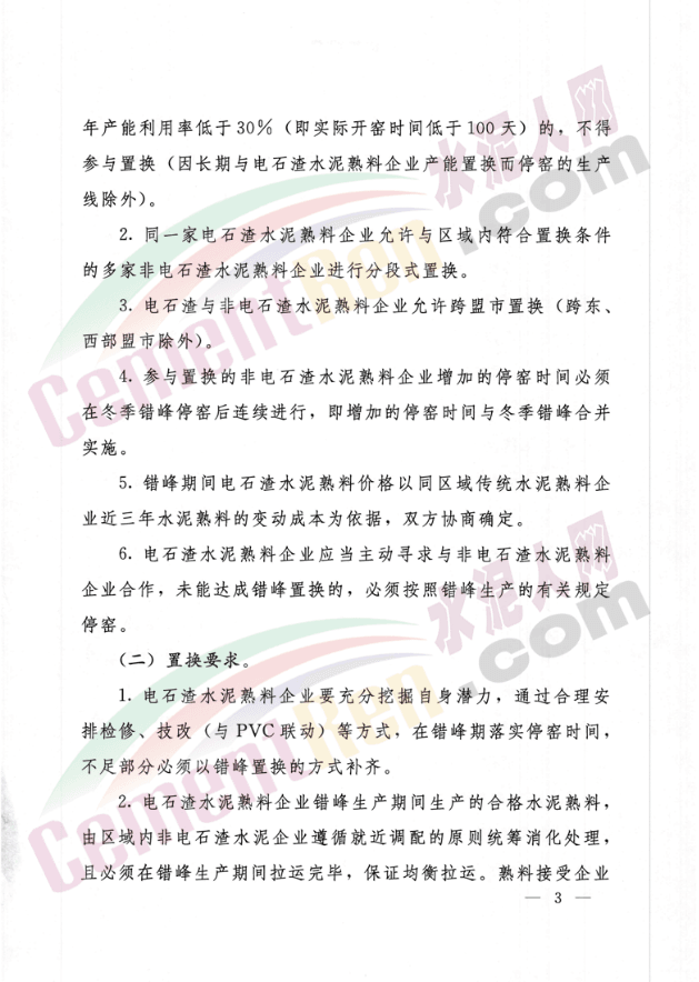 其中,电石渣水泥熟料企业(电石渣水泥熟料生产线)确因特殊原因不能停窑或未达到错峰停窑期限的,必须与当地非电石渣水泥熟料生产企业沟通协调,通过“错峰置换”补齐错峰停窑时间。
