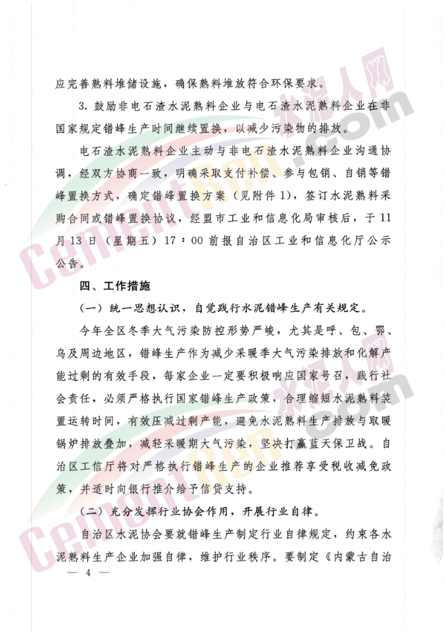 三、参与置换的非电石渣水泥熟料企业增加的停窑时间必须在冬季错峰停窑后连续进行,即增加的停窑时间与冬季错峰合并实施。