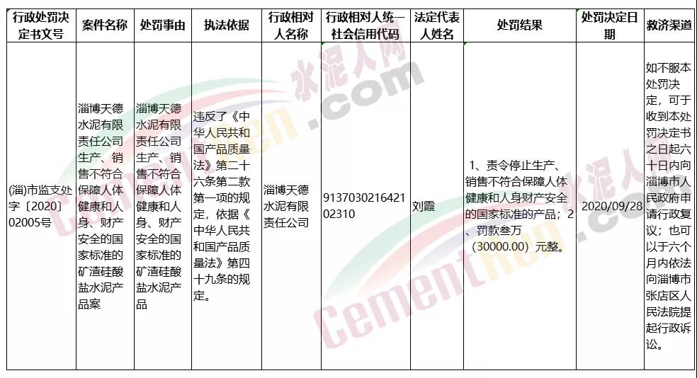 淄博天德水泥有限责任公司生产、销售不符合保障人体健康和人身、财产安全的国家标准的矿渣硅酸盐水泥产品案。淄博天德水泥有限责任公司违反了《中华人民共和国产品质量法》第二十六条第二款第一项的规定,依据《中华人民共和国产品质量法》第四十九条的规定。处罚结果:1、责令停止生产、销售不符合保障人体健康和人身财产安全的国家标准的产品;2、罚款叁万(30000.00)元整。