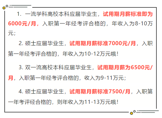 普通本科试用期4500元-6000元/月;试用期3-6个月,期满考评定岗后,以岗定薪,享受年终奖励,年收入约7-12万元,每年根据业绩表现进行调薪。