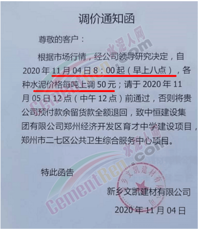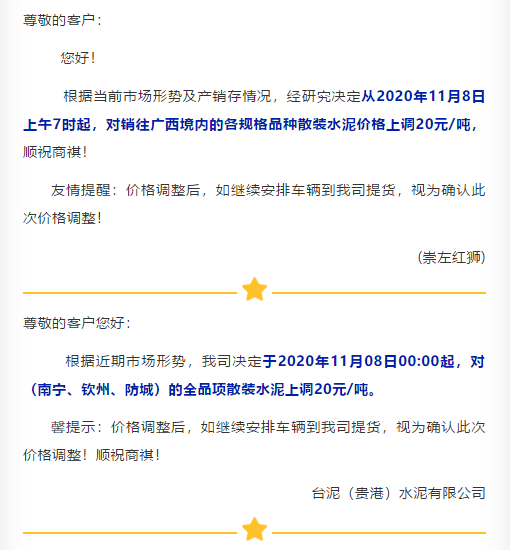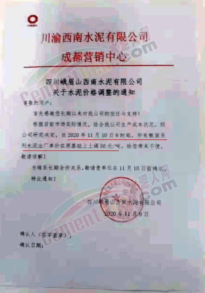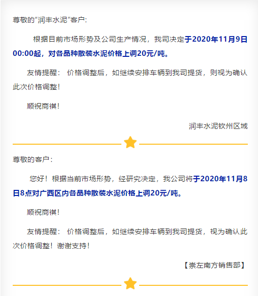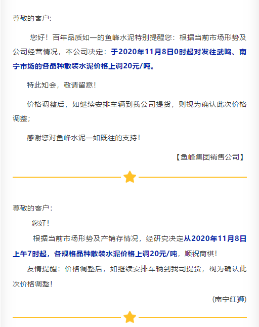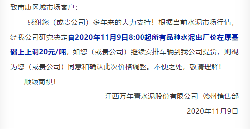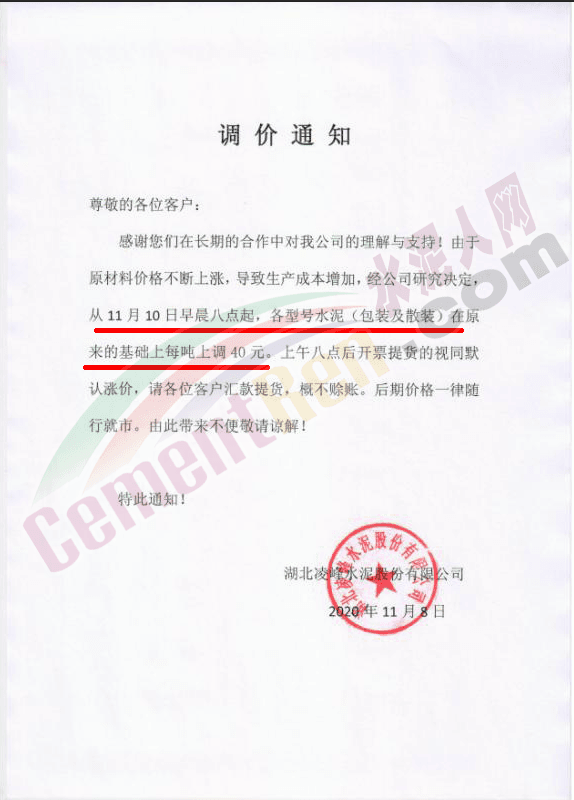 伊通满族自治县主要品牌企业通知下游商砼客户称,受道路交通限载及环保要求等因素影响,水泥原材料及运输成本大幅上涨,尤其入冬以来煤炭成本涨幅巨大,导致水泥生产成本增加,为公司正常生产经营带来压力。为缓解生产经营成本压力,保证公司正常运营及出厂水泥质量,经公司研究决定上调PO2.5装水泥出厂价160元/吨,运费同步上调20元/吨。