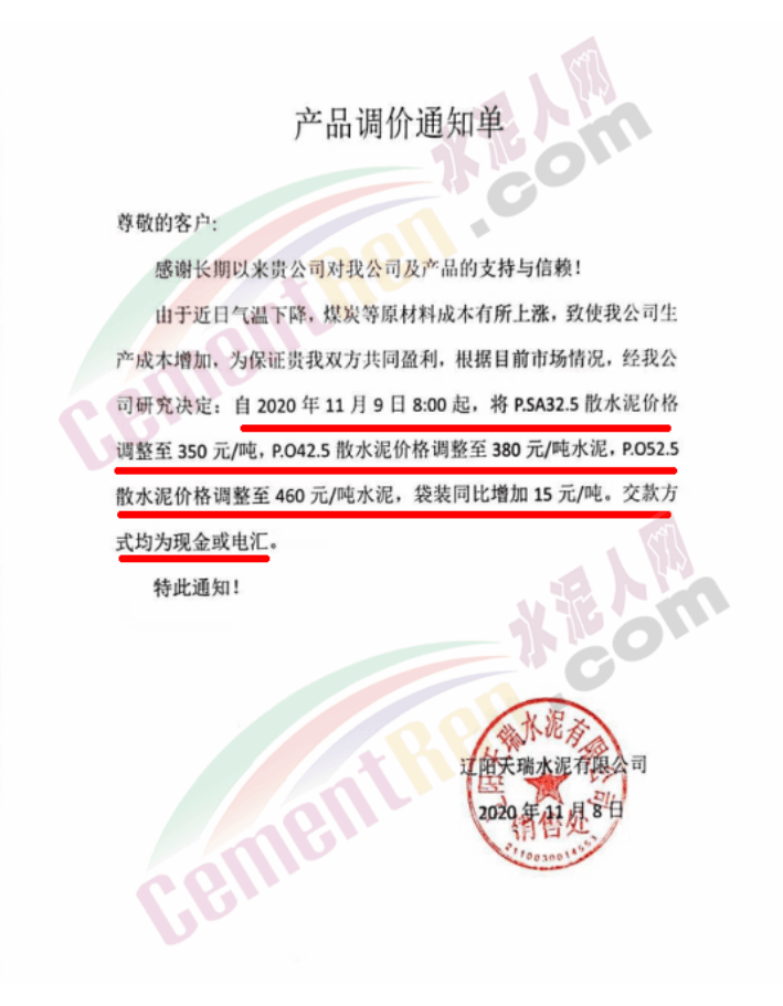 近两日辽宁区域主要品牌企业陆续通知上调水泥价格,且有企业表示库存量有限,本月15日前后或再涨一次。辽阳天瑞水泥通知,由于近日气温下降,煤炭等原材料成本有所上涨,致使工厂生产成本增加。自11月9日时起,将P.S.A散装水泥价格上调至350元/吨,P.O42.5散装水泥上调至380元/吨,P.O52.5散装水泥上调至460元/吨,袋装同比增加15元/吨。交款方式必须为现金或电汇。