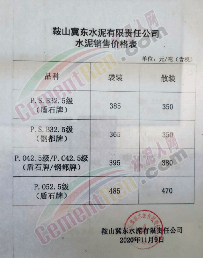 11月9日辽宁鞍山冀东水泥通知执行最新报价,其中P.S.B32.5包装水泥上调至385元/吨,P.O42.5散装水泥上调至380元/吨,P.O52.5散装水泥上调至470元/吨。