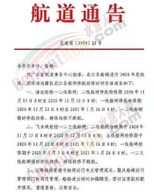据水泥人网了解,日前相关部门通知,经广东省航道事务中心批准,北江各船闸进行 2020年度检修。其中清远枢纽一二线船闸,二线船闸停航检修期2020年11 月15日8时至2020年12月10日8时;一线船闸停航检修期2020年12月22日8时至2021年1月26日8时。一二线船闸错时停航检修,确保检修不断航。飞来峡枢纽一二三线船闸∶二线船闸检修期于2020年11月15日8时至2020年12月10日8时;三线船闸检修期于2020年12月22日8时至2021年1月16日8时;一线船闸检修期于2021年1月3日8时至2021年1月26日8时,一二三线船闸错时停航检修,确保检修不断航。