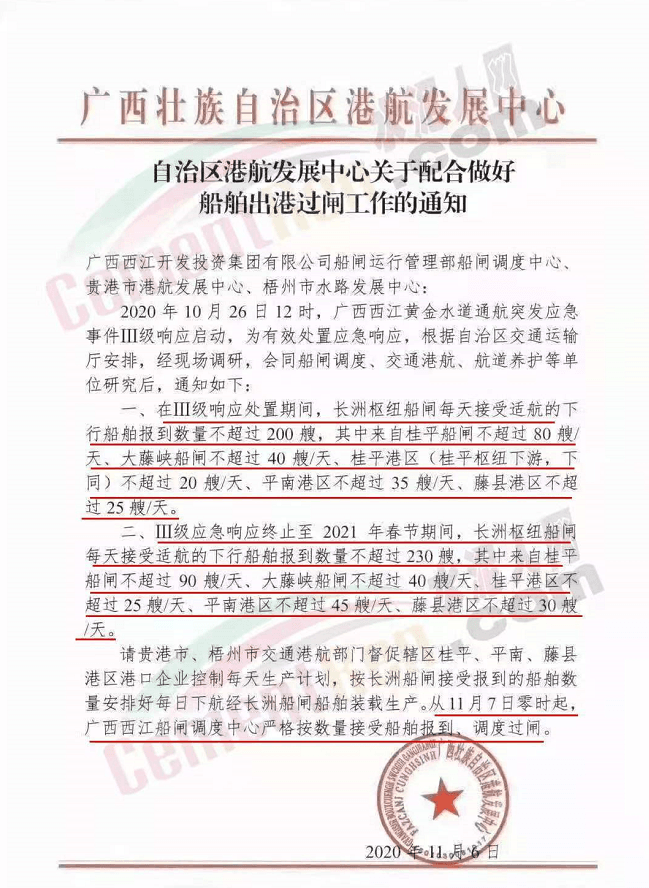 同期,广西壮族自治区港航发展中心通知称,2020年10月26日12时,广西西江黄金水道通航突发应急事件Ⅲ级响应启动,为有效处置应急响应,根据自治区交通运输厅安排,经现场调研,会同船闸调度、交通港航、航道养护等单位研究后,要求在Ⅲ级响应处置期间,长洲枢纽船闸每天接受适航的下行船舶报到数量不超过200艘。Ⅲ级应急响应终止至 2021年春节期间,长洲枢纽船闸每天接受适航的下行船舶报到数量不超过230艘。从11月7日零时起,广西西江船闸调度中心严格按数量接受船舶报到、调度过闸。