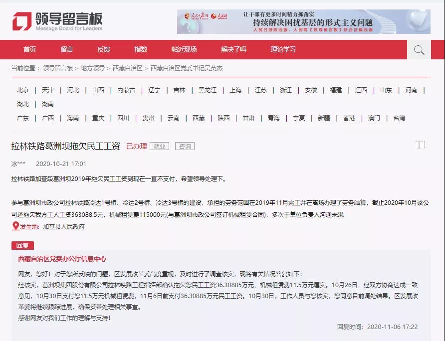 西藏自治区党委办公厅信息中心回复称:“网友,您好!对于您所反映的问题,区发展改革委高度重视,及时进行了调查核实,现将有关情况答复如下:经核实,葛洲坝集团股份有限公司拉林铁路工程指挥部确认拖欠您民工工资36.30885万元、机械租赁费11.5万元属实。10月26日,经双方协商达成一致意见,10月30日支付您11.5万元机械租赁费,11月6日前支付36.30885万元民工工资。10月30日,工作人员与您核实,您同意目前调处结果。区发展改革委将继续跟踪进展,确保妥善处理相关事宜。感谢网友对我们工作的理解与支持!”