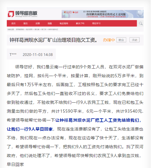 葛洲坝拖欠工资并非个例,11月3日,另一网友在人民网《领导留言板》留言称,云南来的一行9人,在双河水泥厂做偏坡防护,挂网,按6元一个平米,按量计算,刚开始说的5万多平米,到最后只有1万5平米左右,后面施工,工程按照包工头的要求完工已经十多天了,然后包工头他们一直验收不过的名义,要求工人们免费给他们做到验收通过,不验收就不给农民工工钱,现在已和包工头测量出共计15590平米,6元一个平米,共计93540元。希望领导能帮忙协调一下让钟祥葛洲坝水泥厂把工人工资先结给大家,让9名工人早日回家。工人现在连生活费都没有了。已经等了快十天了,希望领导帮忙协调一下,把9名工人的工资先付清。已经找过双河政府,他们说处理不了,希望领导能尽快帮农民工拿到血汉钱。