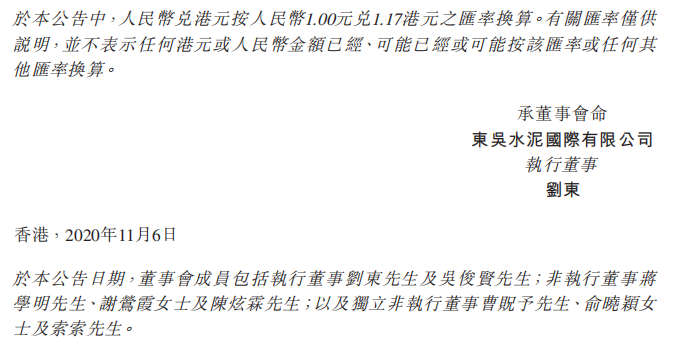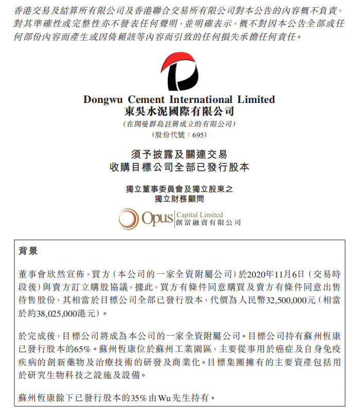 东吴水泥(00695)发布公告,于2020年11月6日,公司全资附属公司熙华(上海)投资管理有限公司作为买方,拟人民币3250万元向卖方东方恒信资本控股集团有限公司购买目标公司(东方恒康生命科学有限公司)全部已发行股本。