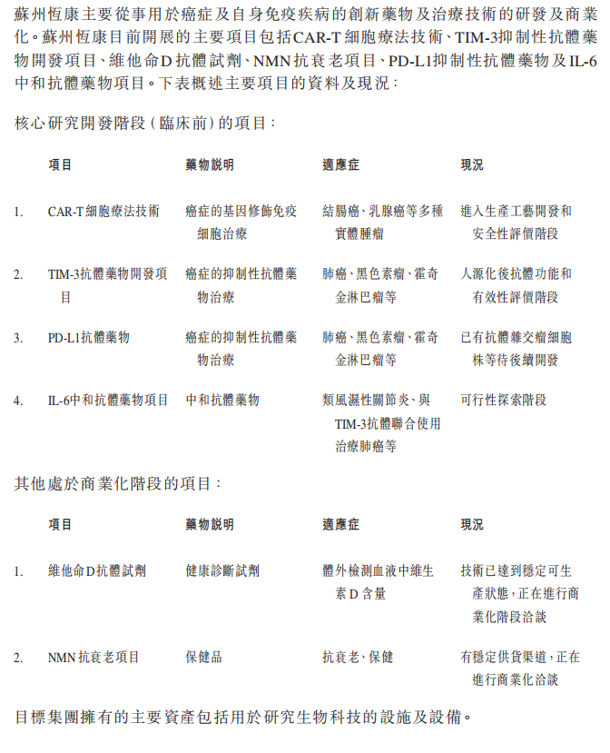 目标集团(目标公司及苏州恒康)拥有的主要资产包括用于研究生物科技的设施及设备。