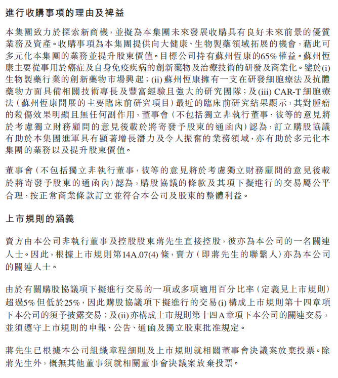 鉴于:生物制药行业的创新药物市场兴起;苏州恒康拥有一支在研发细胞疗法及抗体药物方面具备相关技术专长及丰富经验且强大的研究团队;及CAR-T 细胞疗法(苏州恒康开展的主要临床前研究项目)最近的临床前研究结果显示,其对肿瘤的杀伤效果明显且无任何副作用,董事会认为,订立购股协议有助于集团进军具有显著增长潜力及令人振奋的业务领域,亦有助于多元化集团的业务以及提升股东价值。
