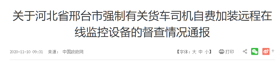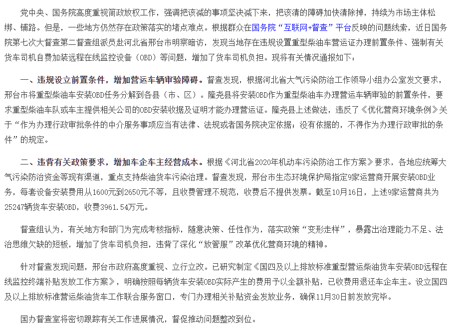 根据《河北省2020年机动车污染防治工作方案》要求,各地应统筹大气污染防治资金等现有渠道,重点支持柴油货车污染治理。督查发现,邢台市生态环境保护局指定9家运营商开展安装OBD业务,每套设备安装费用从1600元到2650元不等,且收费管理不规范,收费后不提供发票。截至10月16日,上述9家运营商共为25247辆货车安装OBD,收费3961.54万元。督查组认为,有关地方和部门为完成考核指标,随意决策、任性作为,落实政策“变形走样”,暴露出治理能力不足、法治思维欠缺的短板,增加了货车司机负担,违背了深化“放管服”改革优化营商环境的精神。针对督查发现问题,邢台市政府高度重视、立行立改。已研究制定《国四及以上排放标准重型营运柴油货车安装OBD远程在线监控终端补贴发放工作方案》,明确按照每辆货车安装OBD实际产生的费用予以全额补贴,已收费用退还车企车主。设立国四及以上排放标准营运柴油货车工作联合服务窗口,专门办理相关补贴资金发放业务,确保11月30前发放完毕。国办督查室将密切跟踪有关工作进展情况,督促推动问题整改到位。