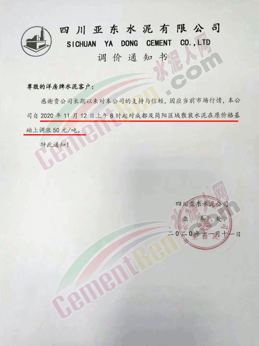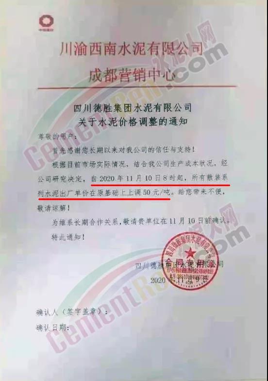 渝西南水泥成都营销中心德胜集团、绵竹澳东水泥、利森建材集团、北川中联水泥、安县中联水泥通知11月10日早8时起起5家工厂散装水泥出厂价格同步上调50元/吨 。