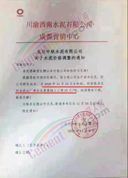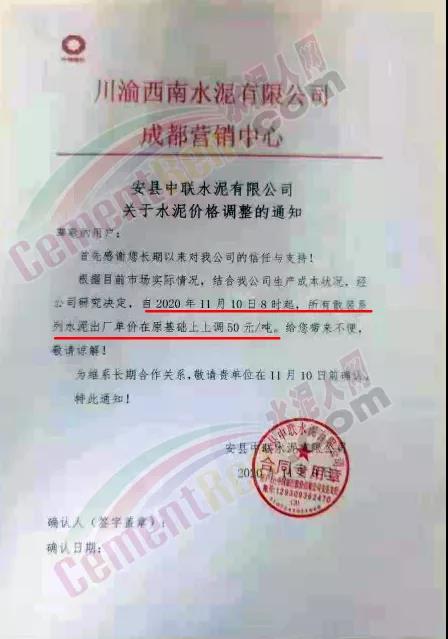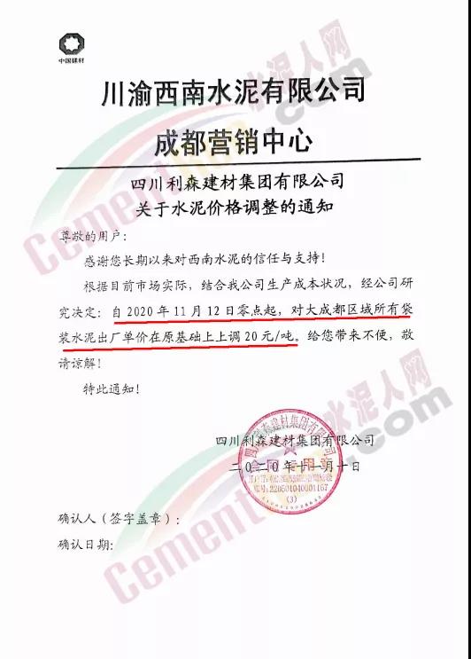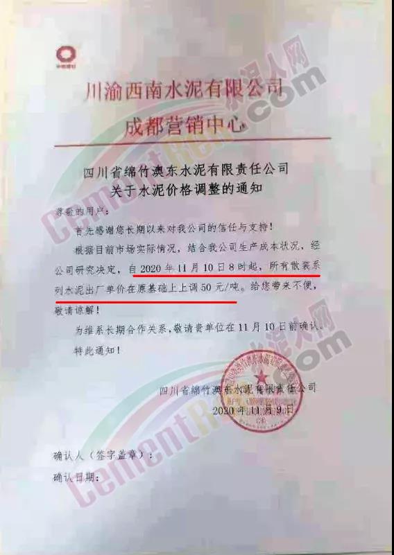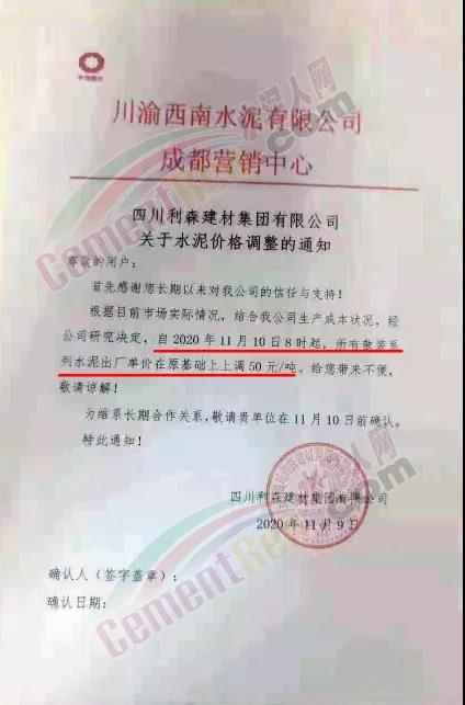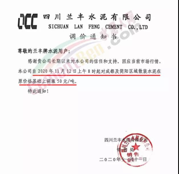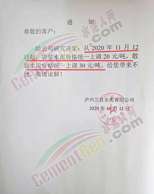泸州兰良水泥有限公司通知自11月12日起,袋装水泥统一上调20元/吨,散装水泥价格统一上调30元/吨。