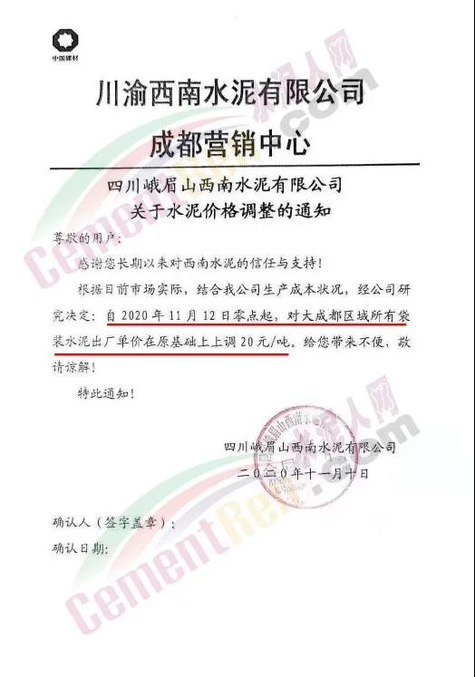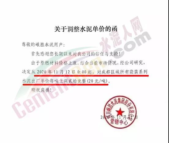川渝西南水泥成都营销中心四川利森建材、峨眉山西南水泥等多家企业通知自12日起,对大成都区域所有袋装水泥出厂价上调20元/吨。