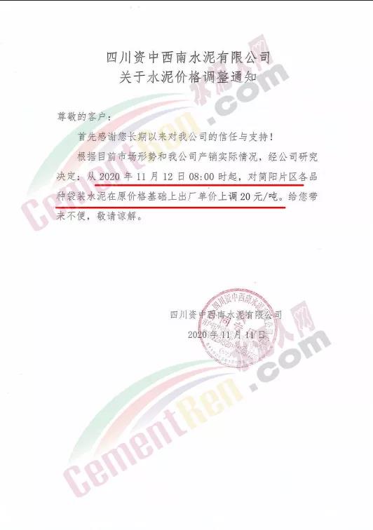 四川资中西南水泥通知自12日起上午8时起,对简阳片区各品种袋装水泥出厂价上调20元/吨。